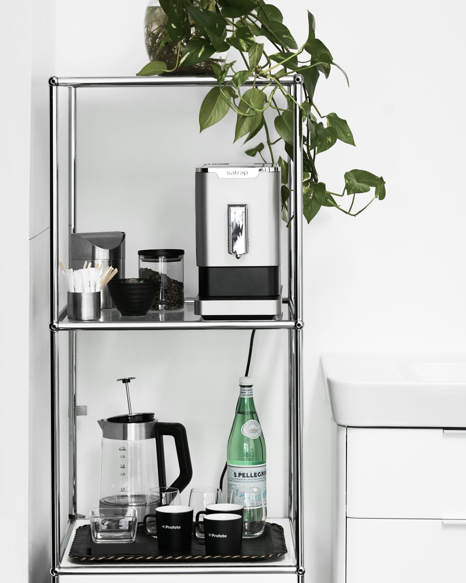 Kaffeemaschine zur freien Nutzung und Mineralwasser.